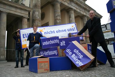 Das Wetter war wider Erwarten doch recht gut. Als die ersten Aktivisten von Mehr Demokratie am 7. März morgens um 9.00 Uhr den Platz vor dem Brandenburger Tor in Berlin betraten, regnete es nicht. Dort wurden zwei blaue Mauern aus Pappkartons aufgebaut. Eine von ihnen symbolisierte die alte, undemokratische und ohne die Bürger zustande gekommene EU Verfassung. Abgelehnt prangte als Stempel auf ihr. Die andere Mauer stand für eine demokratische, durch einen europaweiten Volksentscheid zustande gekommene europäische Verfassung. Nach dem geglückten Aufbau standen beide Mauern eine ganze Weile vor dem Brandenburger Tor und lockten Touristen, Schaulustige und Interessierte an.