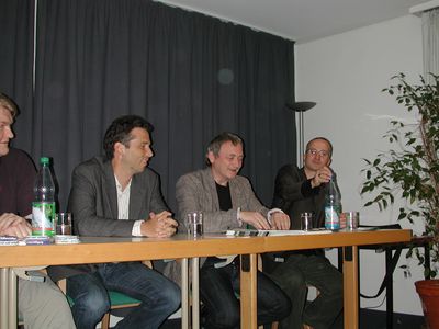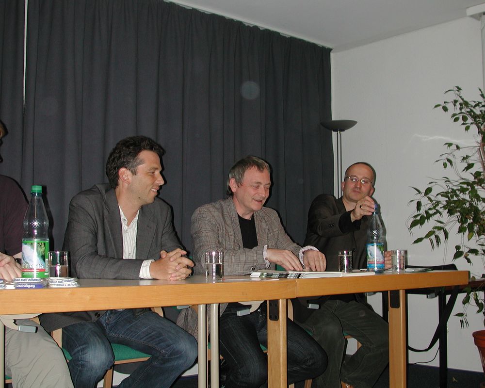 Auf dem Podium diskutierten Daniel Schily, Bundesvorstandsmitglied von Mehr Demokratie und Michael von der Lohe vom OMNIBUS für Direkte Demokratie mit Hendrik Wittenberg von der Kölner "Initiative Bedingungsloses Grundeinkommen" über eine soziale Grundsicherung für alle Menschen.