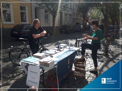 Großes Interesse zeigten die Bonnerinnen und Bonner an unseren Publikationen „Klimawende von unten“ und „Handbuch Klimaschutz“, die unsere Kollegin Ina Kuhl sowie Landesvorständin Gisela von Mutius bei bestem Wetter vorstellten.