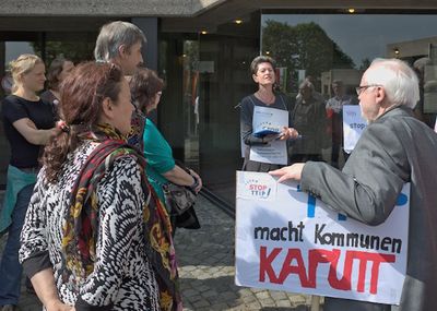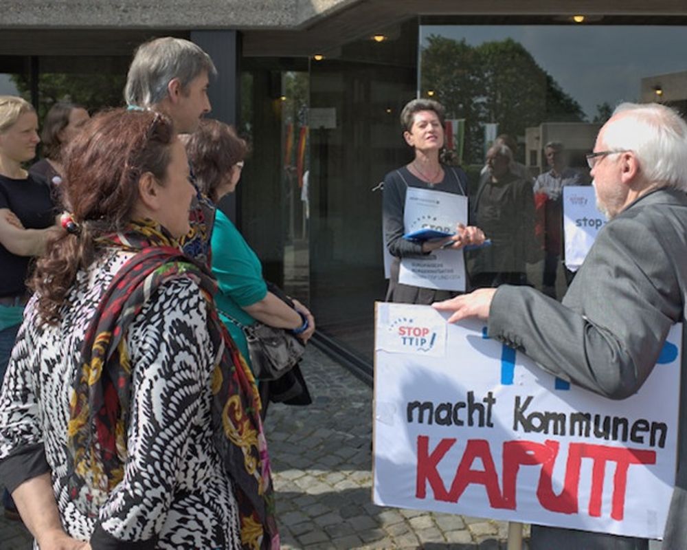 Von Mutius: Zurzeit bearbeiten wir drei Themen: erstens informieren wir zusammen mit anderen im Bonner Bündnis gegen TTIP an Infoständen, mit Aktionen und Veranstaltungen über die sogenannten Freihandelsabkommen CETA, TTIP und TiSA, weil sie die Demokratie und den Rechtsstaat aushebeln. Und wir sammeln Unterschriften für die selbstorganisierte Europäische Bürgerinitiative „Stop TTIP“.