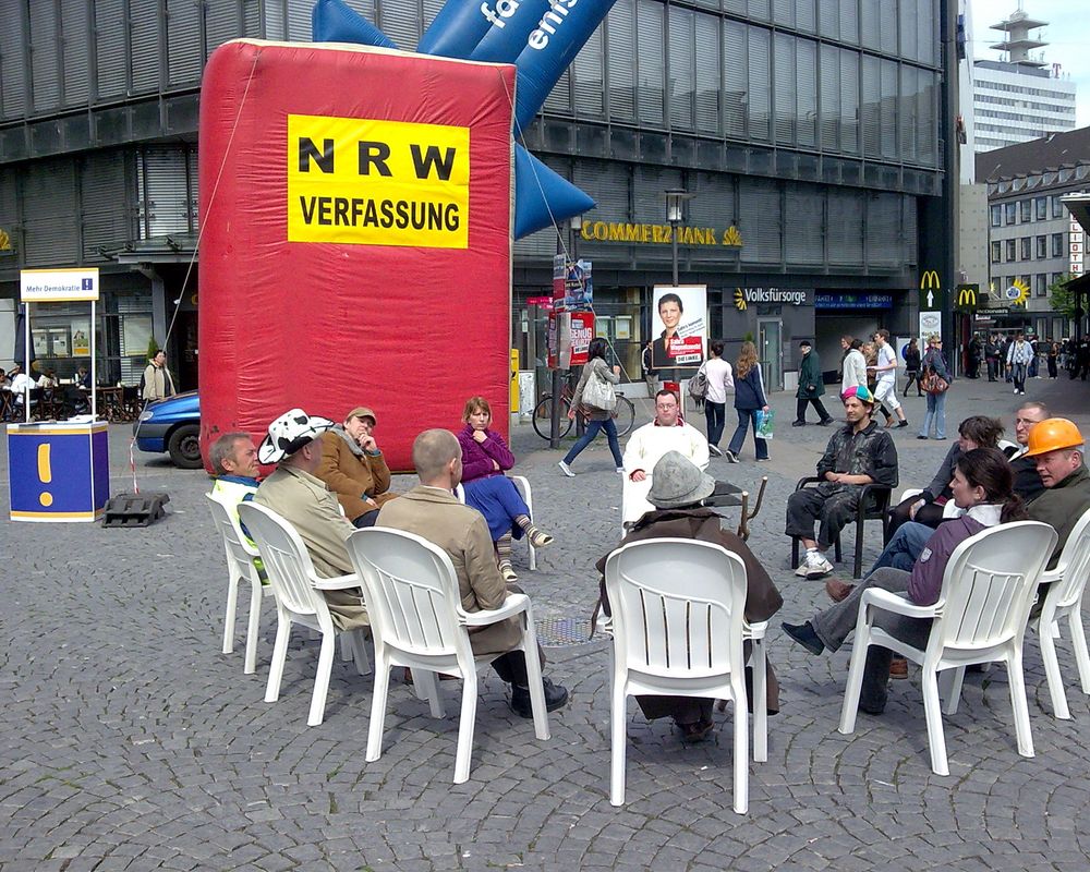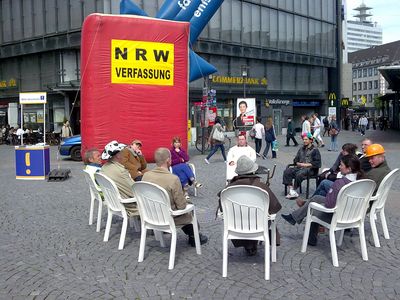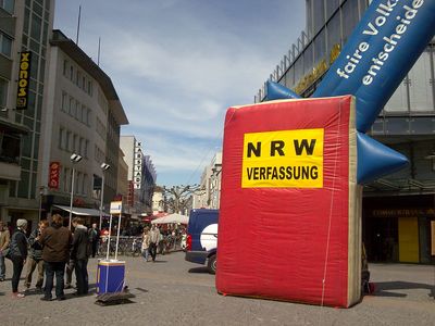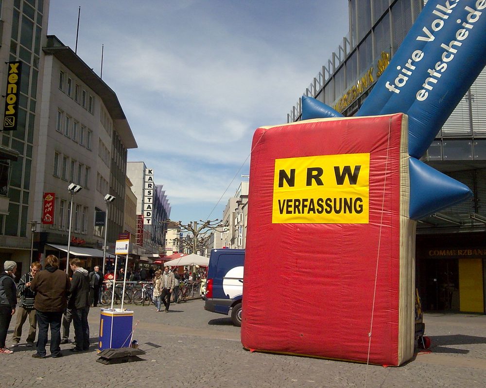 Pünktlich um 11.00 treffen Fabian, der aus Witten angereist ist und ich zeitgleich ein. Auf der anderen Seite des Jahnplatzes, wo wir das Gummi-Gesetz aufbauen, findet heute ein Tag der Gleichberechtigung von Menschen mit Behinderung statt. Das bunte Bühnenprogramm und das strahlende Sonnenwetter sorgen bei den Passanten und auch bei uns den ganzen Tag für gute Laune. Aus anderen Städten sind wir teils mühevolle Momente gewohnt; hier kommen viele Menschen uu uns an den Infostand - dank eines gut platzierten Ankündigungsartikels im Lokalteil der Neuen Westfälischen. Wir werben zwei neue Mitglieder, sammeln dutzende Unterschriften, unter anderem die der Direktkandidaten von Linken und Grünen und haben Riesenspaß an den einfallsreichen Aktionen des Straßenfests gegenüber. Wie im Flug vergeht die Zeit. Wir packen mit der Hilfe von Volker Vorwerk in Windeseile ein und machen uns auf den Weg zur Unterkunft bei Fabians Eltern in Detmold. Wir freuen uns schon auf die Aktion heute in Herford!