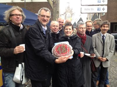 Mit einer Torte haben Vertreter von Mehr Demokratie, Ratsmitglieder verschiedener Parteien und Vertreter von Bürgerinitiativen am 17. Oktober in Köln und Aachen den 18. Geburtstag des kommunalen Bürgerentscheids in NRW gefeiert. Am 17. Oktober 1994 waren die Spielregeln für die direkte Demokratie vor Ort in Kraft getreten. 18 Jahre später zählen wir 621 Bürgerbegehren und 173 Bürgerentscheide zwischen Rhein und Weser.