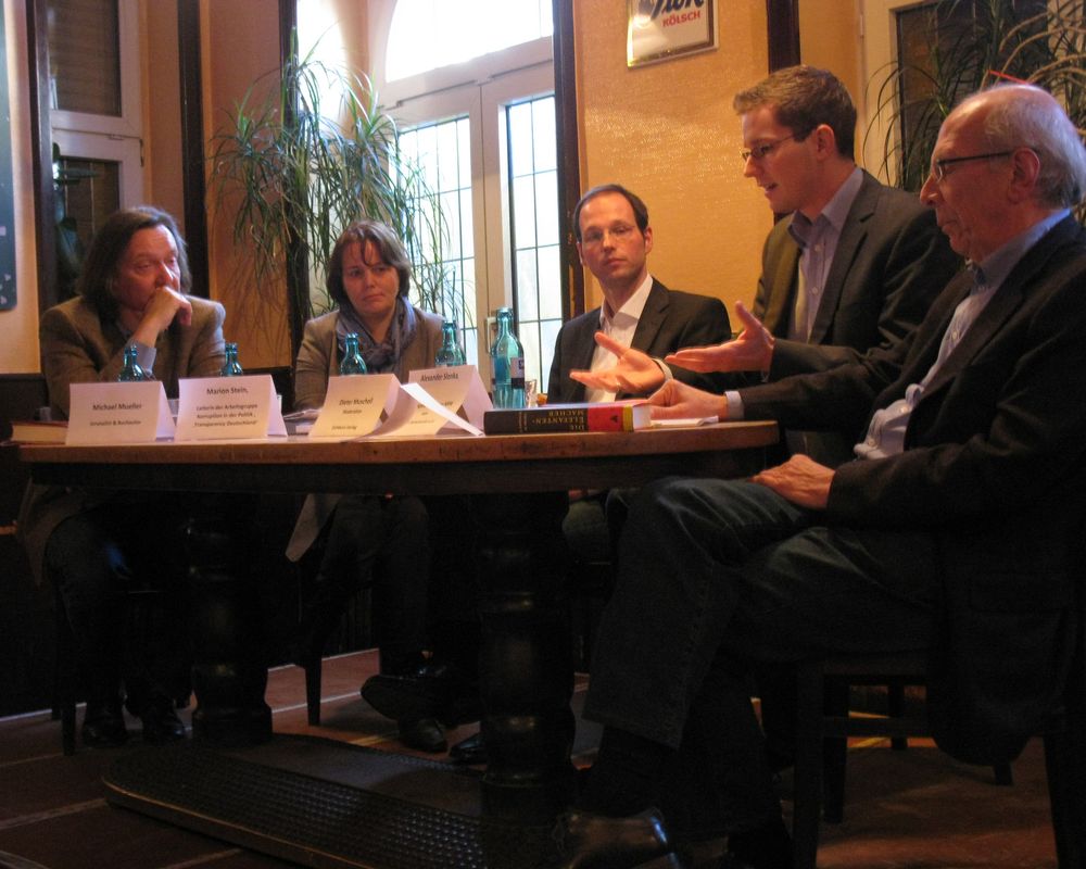 Korruption in der Politik war am 30. Januar bei der Veranstaltung „Die Parteien, die Macht und das Geld“ das Thema im Petersberger Hof in Köln. Die Buchautoren Rudolf Lambrecht und und Michael Müller diskutierten mit Alexander Slonka, Landesgeschäftsführer von Mehr Demokratie und Marion Stein von Transparency International über Parteienfinanzierung, politische Korruption und die Steuerung der Politik durch Wirtschaft und Industrie.