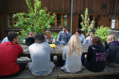 Nach der Mittagspause geht die Diskussion im Arbeitskreis „Zivilgesellschaft“ weiter. Seminarleiter Thomas Schmidt zeigt den oben erwähnten Film. Danach haben die Teilnehmer viele Fragen und wir kommen auch auf die mangelnde demokratische Kontrolle internationaler Abkommen zu sprechen. Wenn es keine Öffentlichkeit gibt, keinen geregelten Ablauf, sondern vor allen Dingen informelle Absprachen, die am Ende in Verträge gegossen werden, wo bleibt dann die Demokratie? Wie wichtig sind hier Organisationen wie die Klimapiraten, die den Entscheidern durch ihre Präsenz auf solchen Konferenzen das Gefühl geben, nicht völlig unbeobachtet schalten und walten zu können! Und damit haben wir auch schon die erste von vielen Antworten auf die Kernfrage des Seminars gefunden. Wer die Gesellschaft gestaltet? Jeder und jede einzelne, der sich für die wichtigen Fragen in unserer Gesellschaft engagiert.