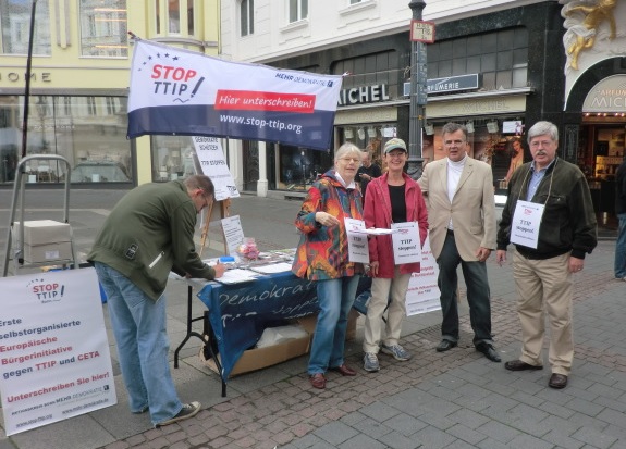 [weiter...]Am 11. Oktober fand ein europaweiter Aktionstag gegen die Freihandelsabkommen TTIP und CETA statt. Auch Aktive von Mehr Demokratie haben sich vor Ort an den Protesten beteiligt: Dabei haben sie Unterschriften für die selbstorganisierte EU-Bürgerinitiative „Stop TTIP“ gesammelt. Dabei kamen bei rund…